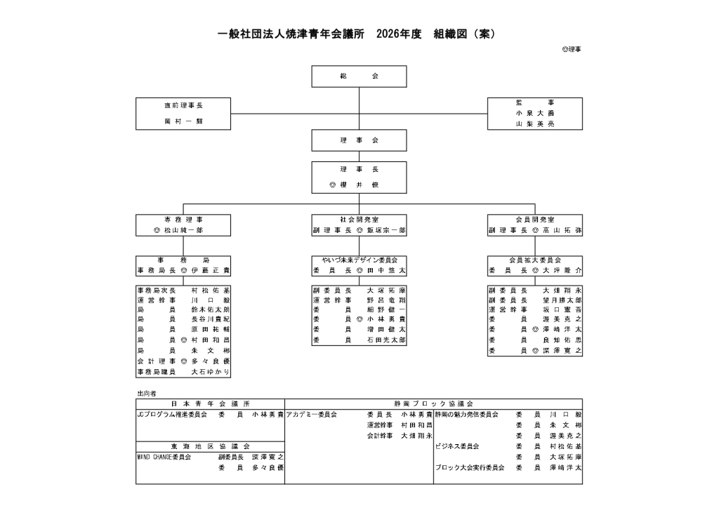 本年度は、事務局、会員開発室、社会開発室の体制を構築します。それぞれの室において、経 験豊富な無任所理事を配置することで、委員会運営および理事会運営において、質の高さと円滑 さを実現します。本年度は、例年より委員会数を減らし、1 委員会あたりの委員を増やす体制と します。これにより、多様な経験や視点を集約し、事業の質の向上と、より良い運動の創出を目 指します。こうした体制により、焼津青年会議所全体としての組織力の向上と更なる発展を目指 します。